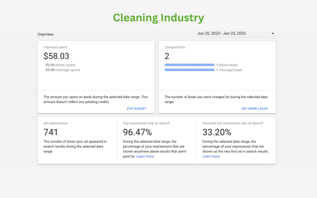 Even with a small test budget, we secured a 33% absolute top-of-page rate for this local cleaning business.